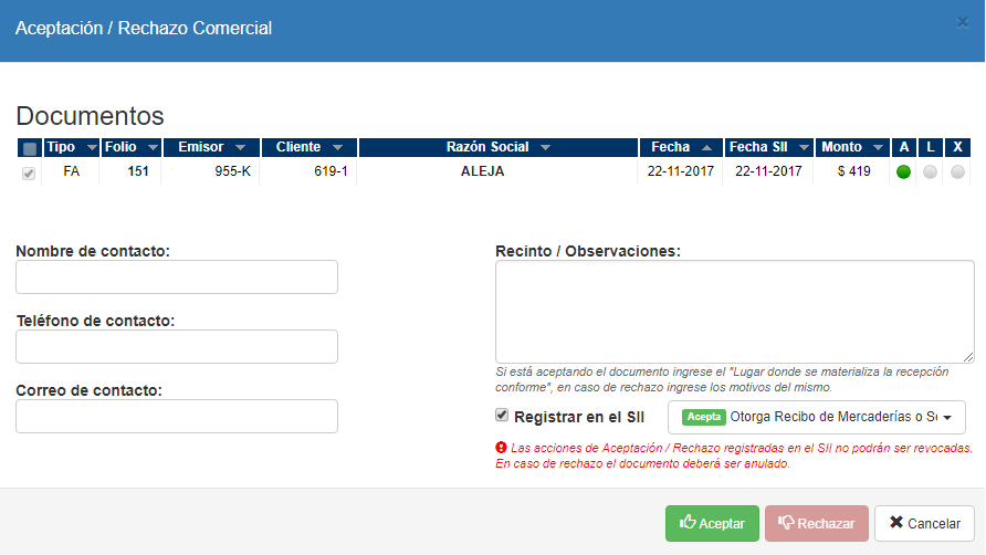 - Puede realizar la aceptación/rechazo informando solo a su cliente (sin seleccionar la opción “Registrar en el SII”) o enviarla simultáneamente al Servicio de impuestos internos (seleccionar opción “Registrar SII”).