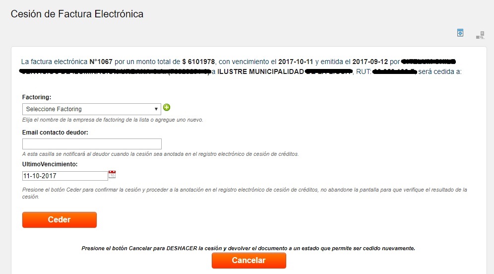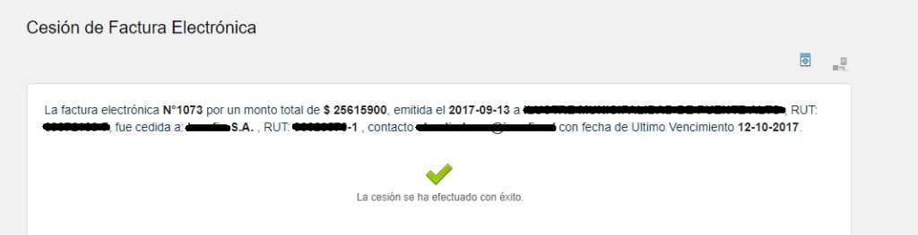 NOTA: Es importante destacar que una cesión se podrá realizar solo si un documento electrónico no tiene asociada una nota de crédito y su forma de pago no corresponde a Contado. De igual manera, el tiempo de respuesta dependerá de la velocidad de procesamiento por parte del Servicio de Impuestos Internos.