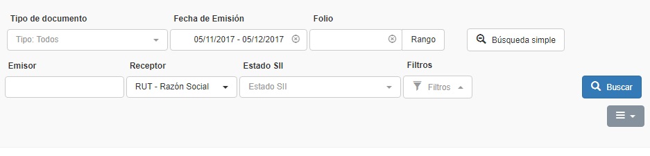 Situada al costado derecho de la lupa de búsqueda, este botón permitirá al usuario realizar una búsqueda detallada según campos específicos (tipo DTE, fecha emisión, folio, rango, RUT emisor/receptor, estado SII, filtros).