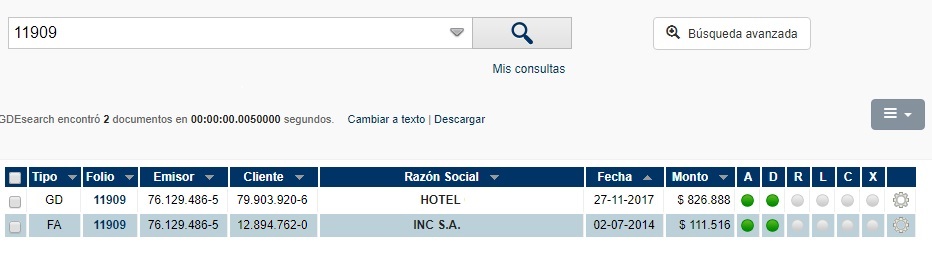 Si está en conocimiento del usuario el folio a buscar, solo será necesario que lo ingrese en la barra de búsqueda y aparecerán todos los registros que coincidan con el valor especificado. En base a esto, será responsabilidad del usuario identificar cuál es el documento buscado. Ej: búsqueda de folio 11909