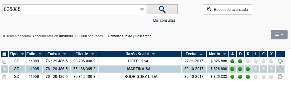 Búsqueda por Monto: Si está en conocimiento del usuario el monto total a buscar, solo será necesario que lo ingrese en la barra de búsqueda y aparecerán todos los registros que coincidan con el valor especificado. En base a esto, será responsabilidad del usuario identificar cuál es el documento buscado. Ej: búsqueda por monto $826.888