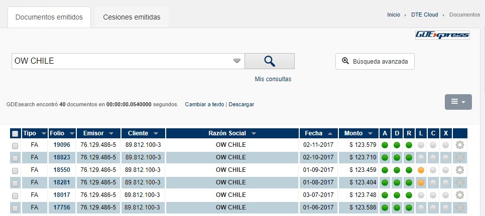 Búsqueda por Razón Social: Si está en conocimiento del usuario la razón social a buscar, solo será necesario que lo ingrese en la barra de búsqueda y aparecerán todos los registros que coincidan con el valor especificado. En base a esto, será responsabilidad del usuario identificar cuál es el documento buscado. Ej: búsqueda para razón social OW CHILE