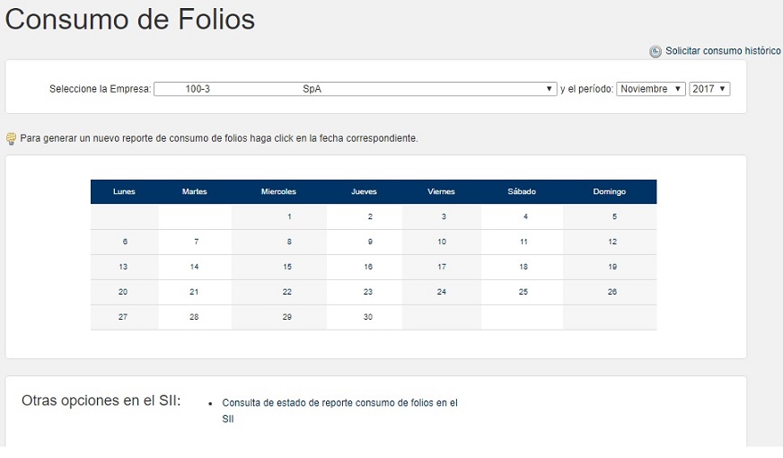 - Consulta de estado de reporte: redirecciona a sitio web del SII donde podrá consultar sobre los consumos emitidos/pendientes.