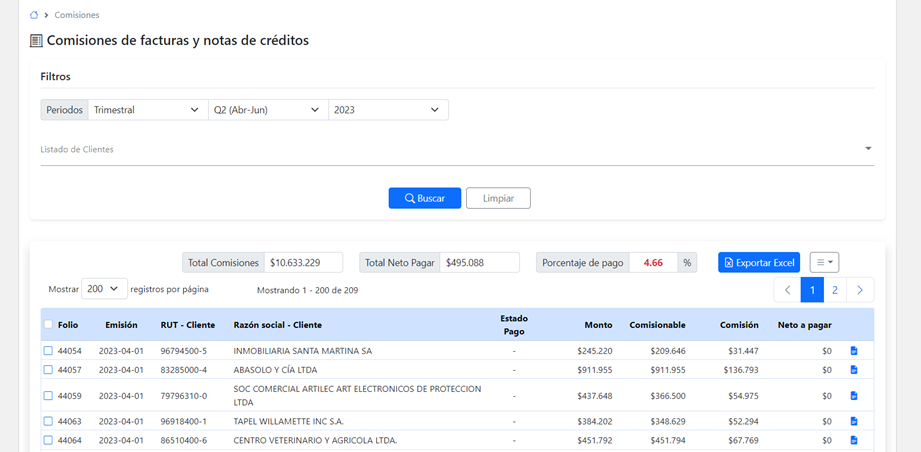Se muestra el total de comisiones, el Neto a Pagar y el porciento que representa
