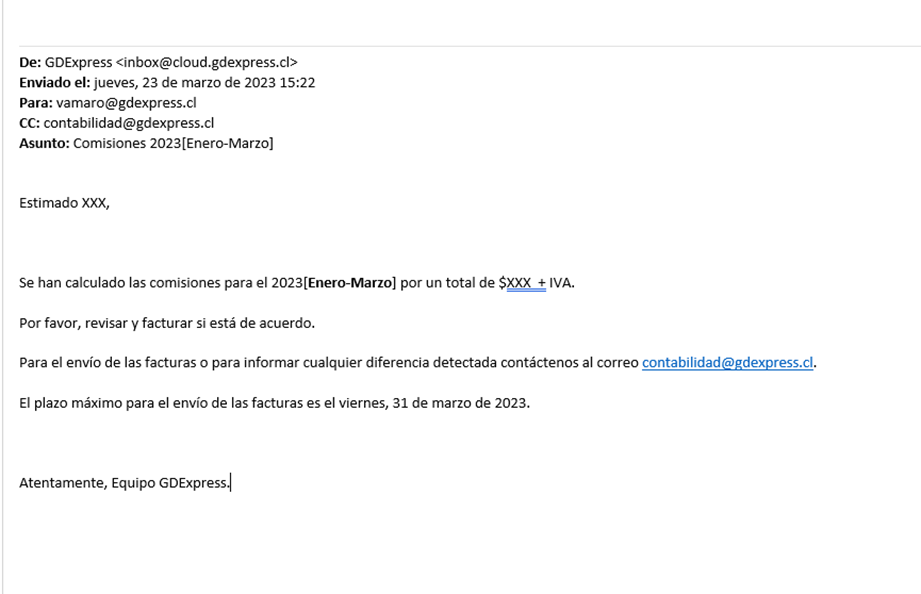 Una vez que GDE calcula y revisa las comisiones, indica Informar, en dicho momento llega un mail al Partner informando que ya están las comisiones del periodo